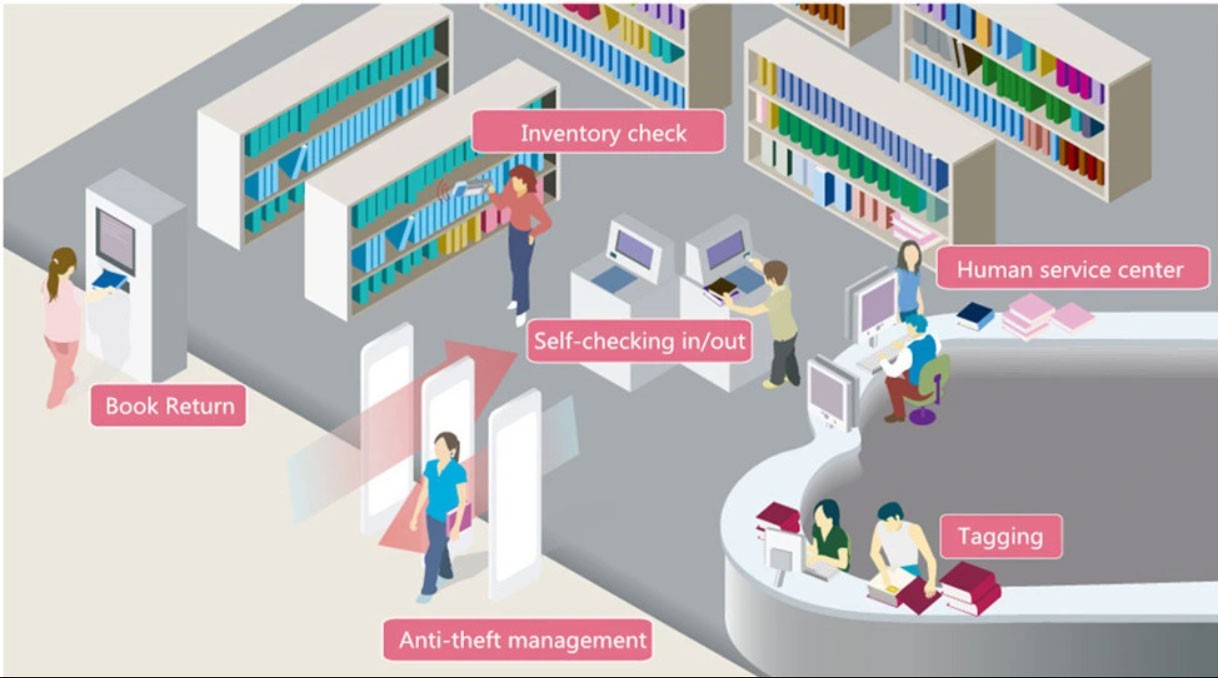Jiwasax hardware ukat software phuqhat biblioteca ukatakix gestión ullart’irinakaru ukhamarak libroruw churapxta. Nayra pacha código de barras ukamp chikancht’asiñaxa, RFID ukax juk’amp ventaja ukaniwa. Etiqueta RFID ukaxa mä sapa ID ukampikiwa, ukaxa mä seguro ID libroru churaraki. Ukhamarus, etiqueta RFID ukax juk’amp jank’akiw uñakipt’i, ukatx muti-etiquetas ukax pachpa pachan uñakipt’arakispawa, ukax sistema ukan irnaqawipan efectop jilxatayaraki. Terminal de centro de servicios RFID ukax ullart’irinakax jupanakpachaw sayt’asipxañapatak jaytawayi, ukañkamax ullart’irinakax cuentap jupanakpachaw apnaqapxaspa ukat liquidación lurapxaspa . RFID kutt’ayañ maquinanakax ullart’irinakatakix mä mantañ churaraki, jupanakpachaw pankanak kutt’ayapxañapataki. Mä ch’ikhi punkux mantañapataki ukhamarak mistuñapatakix jaqinakan sarnaqawip uñt’araksnawa ukat jan autorizada libronak bibliotecat apsuñ jark’aqaraksnawa. Mä escáner RFID ukax libronak thaqhañatakiw apnaqasispa ukat inventario ukar jakthapiñatakiw apnaqasispa. Irnaqirinakax jasakiw pankanakarux mä pegatina RFID ukat RFID Uñakipirimp etiquetapxaspa. Centro de ordenación ukax libronak jank’ak uñakipañ yanapt’i ukat uñstayañataki. Sistema RFID ukax jichha pacha biblioteca ukatakix mä jach’a thakhiwa. Jaqinakan walja irnaqawip kutt’ayañan, uñakipañan, jakthapiñan ukhamarak seguridad lurañanx jisk’achaspawa. Ukañkamax taqi yatiyawinakax base de datos electrónica ukan imatäxiwa, ukampis janiw papel ukan imatäkiti. Ukhamaraki, mä juk’a aski pacha luraraki ullart’irinakataki jupanakpacha irnaqapxañapataki, ukaxa jupanakaruxa mä suma yatxatawi churaraki.