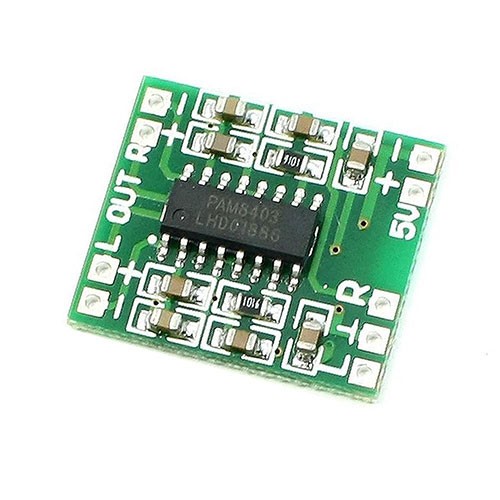 PAM8403 Digital Power Amplifier Module is a 3W, class-D stereo amplifier. It offers low THD+N, allowing it to achieve high-quality sound reproduction, all in a form factor about the size of a US postage stamp.